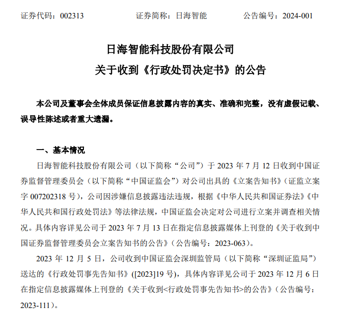 ICC訊 1月4日消息,日海智能(002313.SZ)發(fā)布公告稱,2024年1月2日,公司收到深圳證監(jiān)局送達(dá)的《行政處罰決定書》。