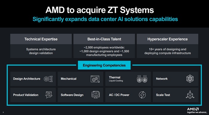 AMD已同意以49億美元的現(xiàn)金和股票交易收購ZT Systems,其中包括基于交易完成后某些里程碑的最高4億美元的或有付款。AMD預(yù)計(jì),到2025年底,該交易將在非公認(rèn)會(huì)計(jì)準(zhǔn)則基礎(chǔ)上實(shí)現(xiàn)增值。