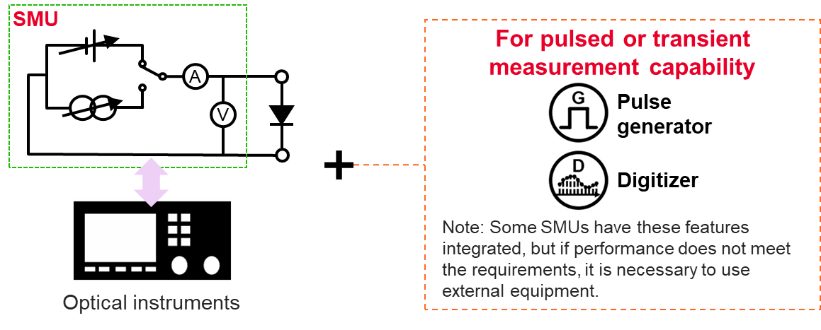 在進行同步光學(xué)測試時,或在進行脈沖或瞬態(tài)測量時,內(nèi)部或外部脈沖發(fā)生器和數(shù)字轉(zhuǎn)換器之間需要在光學(xué)儀器和 SMU 之間實現(xiàn)精確同步。這些要求導(dǎo)致儀器控制和布線復(fù)雜性增加。隨著 SMU 通道數(shù)量的增加,精確同步變得更加重要。從測試軟件開發(fā)的角度來看,整個測試設(shè)置的自動化進一步增加了復(fù)雜性。