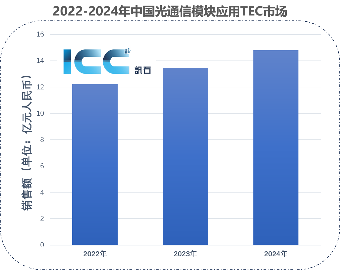根據(jù)ICC訊石與產(chǎn)業(yè)人士溝通了解,光通信TEC市場伴隨著400G/800G高速光模塊出貨量高漲而在最近三年中屢創(chuàng)新高。中國光通信市場光模塊TEC組件銷售額在最近三年以6.59%復(fù)合年增長率(CAGR)達(dá)到2024年14.8億元人民幣,市場主要廠商包括RMT 、FerroTec、Phononic等國外公司,富信、北冰洋等國內(nèi)廠商開始向重要光通信設(shè)備和光模塊客戶導(dǎo)入產(chǎn)品。其他廠商,例如小松主要供應(yīng)日本市場,而Malow主要供應(yīng)其母公司Coherent高意,部分產(chǎn)品向中國發(fā)貨。