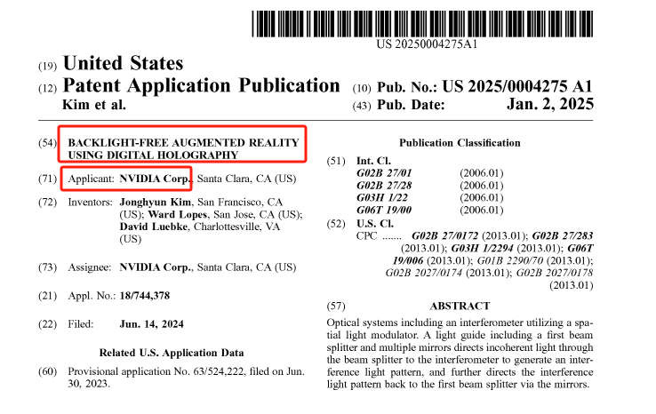 日前,英偉達(dá)在美國(guó)專(zhuān)利及商標(biāo)局官網(wǎng)公開(kāi)了一項(xiàng)名為“無(wú)背光增強(qiáng)現(xiàn)實(shí)數(shù)字全息技術(shù)”的AR眼鏡專(zhuān)利(專(zhuān)利號(hào)US20250004275A1)。