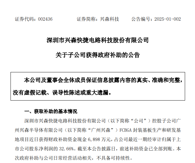 ICC訊 1月7日晚間,深圳市興森快捷電路科技股份有限公司(簡稱“興森科技”或“公司”,002436)發(fā)布關(guān)于子公司獲得政府補助的公告,公司控股子公司廣州興森半導(dǎo)體有限公司FCBGA封裝基板生產(chǎn)和研發(fā)基地項目近日獲得財政補助資金現(xiàn)金6898萬元。此次政府補助預(yù)計增加公司2024年度利潤總額6898萬元,對凈利潤影響約為2710萬元。