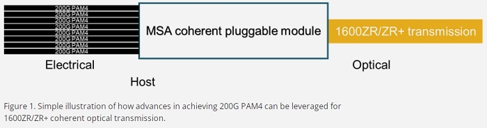 圖 1. 簡單說明如何利用 200G PAM4 技術(shù)的進(jìn)步來實(shí)現(xiàn) 1600ZR/ZR + 相干光傳輸。