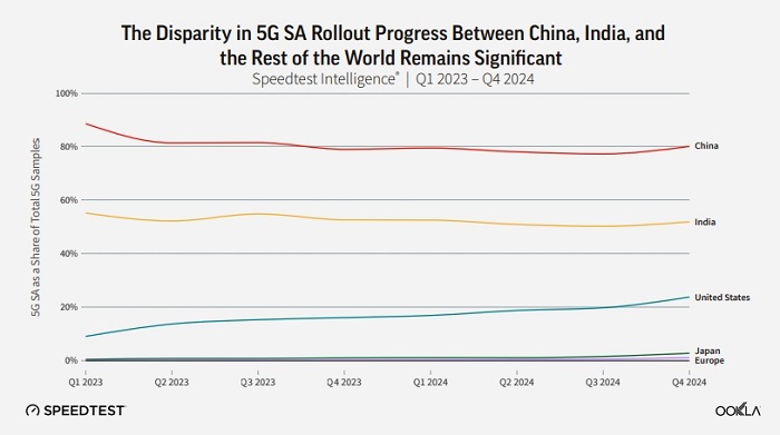 報告通過分析2024年第四季度全球網(wǎng)絡數(shù)據(jù)發(fā)現(xiàn),中國以80%的5G SA網(wǎng)絡覆蓋率穩(wěn)居全球首位,印度(52%)和美國(24%)緊隨其后,而歐洲整體覆蓋率僅為2%,在主要經(jīng)濟體中墊底。在關(guān)鍵性能指標方面,歐洲用戶5G SA網(wǎng)絡下載速度中位數(shù)221.17Mbps,顯著低于美洲的384.42Mbps,也落后于亞太發(fā)達經(jīng)濟體(237.04Mbps)和新興市場(259.73Mbps)。(注:此處的5G SA網(wǎng)絡覆蓋率指5G SA在5G總樣本中所占的比例,如下圖所示)