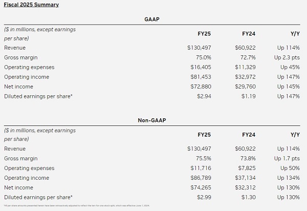 ICC訊 美國加州圣克拉拉,2025年2月26日 -- 英偉達(dá)公司(納斯達(dá)克股票代碼:NVDA)今日公布截至2025年1月26日的第四季度及全年財務(wù)業(yè)績。公司季度營收達(dá)393億美元,環(huán)比增長12%,同比猛增78%;全年營收突破1305億美元,同比增長114%,創(chuàng)歷史新高。
