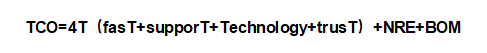 最后,cosT(成本低)指的是我們能提供最低的總擁有成本(TCO, total cost of ownership)。產(chǎn)品的TCO不僅包括客戶采購(gòu)價(jià)格(BOM),應(yīng)是更為全面的概念,是在為客戶創(chuàng)造最大價(jià)值后,能被接受的價(jià)格,即: