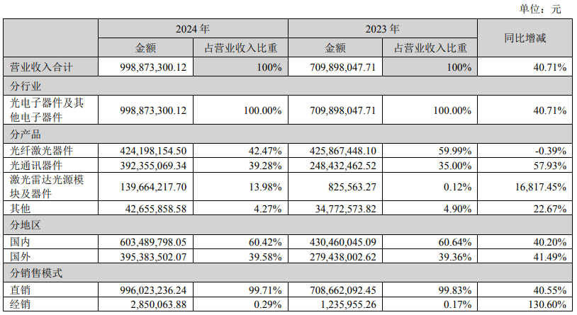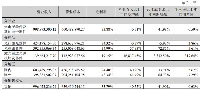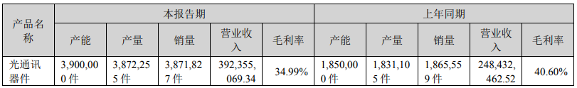 2024年,公司光通訊器件生產(chǎn)量、銷售量分別較上年增長 111.47%、107.54%,主要是數(shù)據(jù)中心需求激增,公司通過技術(shù)創(chuàng)新、推出新產(chǎn)品、積極拓展國內(nèi)外市場,光通訊器件訂單相應(yīng)增加所致。公告指出,2024年公司光通訊器件產(chǎn)能較上年同期增加 205 萬件,上漲 110.81%,產(chǎn)量較上年同期增加 204.12 萬件,上漲111.47%,銷量較上年同期增加 200.63 萬件,上漲 107.54%,營業(yè)收入較上年同期增加 14,392.26 萬元,上漲 57.93%,毛利率較上年下降 5.61%。