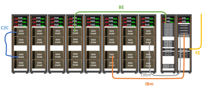 與傳統(tǒng)數(shù)據(jù)中心不同,AI集群的網(wǎng)絡(luò)連接呈現(xiàn)“多場景、高復(fù)雜度”特征。一個典型的AI集群包含5類關(guān)鍵網(wǎng)絡(luò)連接:聚合機柜間連接(Aggregation C2C)、后端連接(Back End)、前端連接(Front End)、帶內(nèi)(In Band)及帶外(Out Band)管理,每類連接對帶寬、密度、延遲、損耗等指標均有差異化要求。例如,聚合機柜間連接需在有限空間內(nèi)實現(xiàn)高密度布線且保持低延遲傳輸;后端連接需應(yīng)對高頻信號干擾下的回波損耗控制;前端連接則需滿足AI推理場景中長距離、低損耗的光信號傳輸需求。這些需求的疊加,使得數(shù)據(jù)中心對網(wǎng)絡(luò)架構(gòu)的高密度適配能力、智能化管理精度及全鏈路可靠性提出了更高要求。
