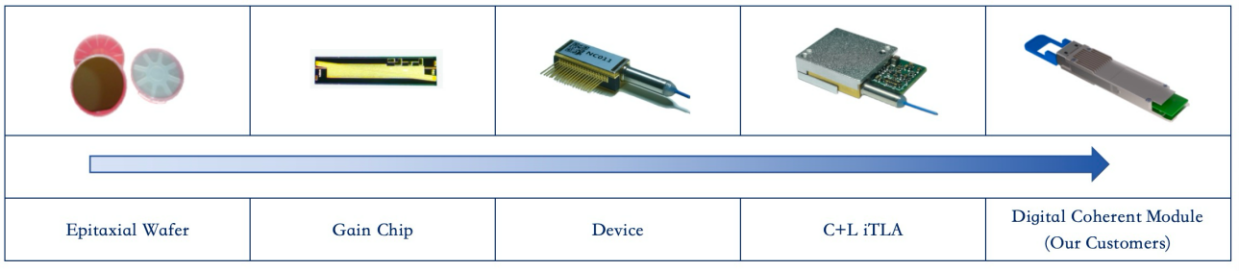 中科光芯依托其在半導(dǎo)體激光器外延生長、光子芯片流片及光器件高密度封裝領(lǐng)域的全鏈條技術(shù)積累,于 2025 年Q2成功推出 C+L波段超緊湊型集成可調(diào)激光器組件(C+L Nano iTLA),目前該產(chǎn)品已完成工程驗證并進入客戶送樣階段,正加速推進商業(yè)化量產(chǎn)進程。