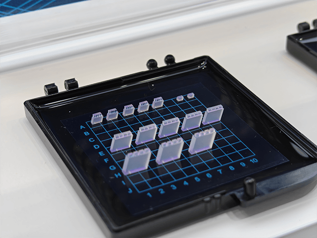 250μm Mini-Block集成光組件:作為展臺亮點,該組件實現(xiàn)光束整形-微米分光-精準轉向-高效聚集-光電轉換的全鏈路優(yōu)化。憑借250μm超小間距設計,大幅提升光模塊內部空間利用率,同時將光信號損耗穩(wěn)定控制在1dB以內,PD響應度可達推薦值,有效解決了光模塊“體積大、功耗高、溫控難”的三大痛點。為硅光集成、高速光通信等前沿領域微小化發(fā)展提供極大的可能性。