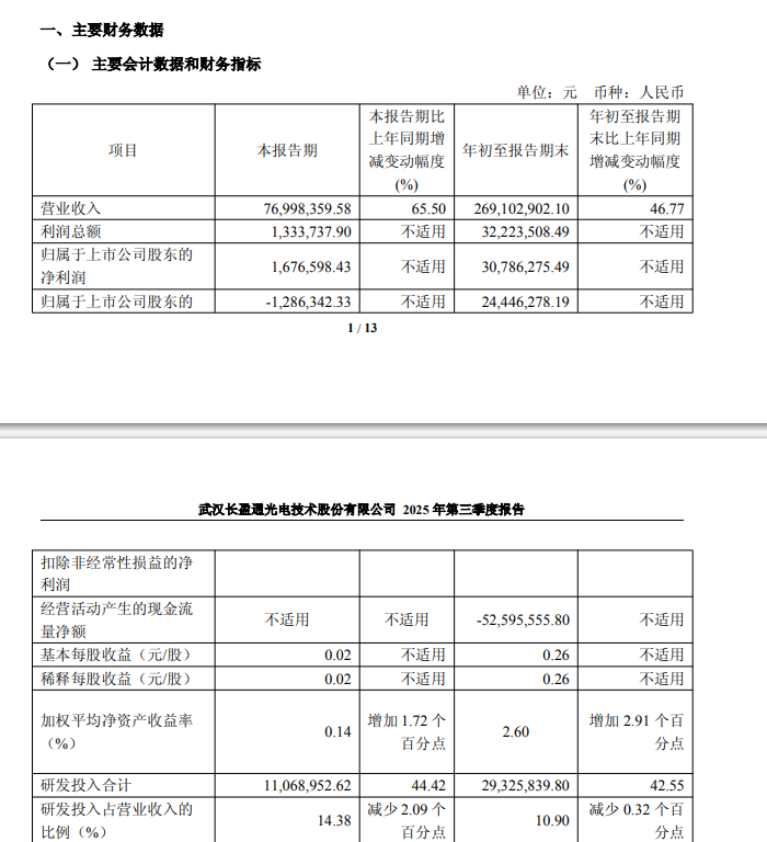 ICC訊 長盈通 10月30日披露2025年第三季度報(bào)告。2025年前三季度公司實(shí)現(xiàn)營業(yè)總收入2.69億元,同比增長46.77%;歸母凈利潤3078.63萬元,同比扭虧;扣非凈利潤2444.63萬元,同比扭虧。公司指出,營收及利潤雙增長主要得益于光纖環(huán)器件訂單交付量的大幅增加,同時(shí)去年確認(rèn)的長飛光纖1000萬元保證金損失本期未再發(fā)生。