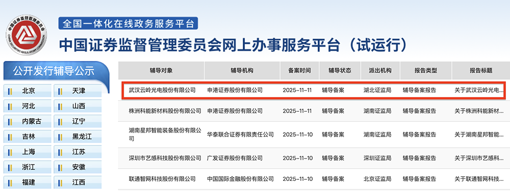 ICC訊 11月11日,證監(jiān)會官網(wǎng)披露,湖北武漢光通信芯片企業(yè)云嶺光電在湖北證監(jiān)局辦理輔導(dǎo)備案登記,啟動北交所上市輔導(dǎo),向資本市場邁出關(guān)鍵一步。
