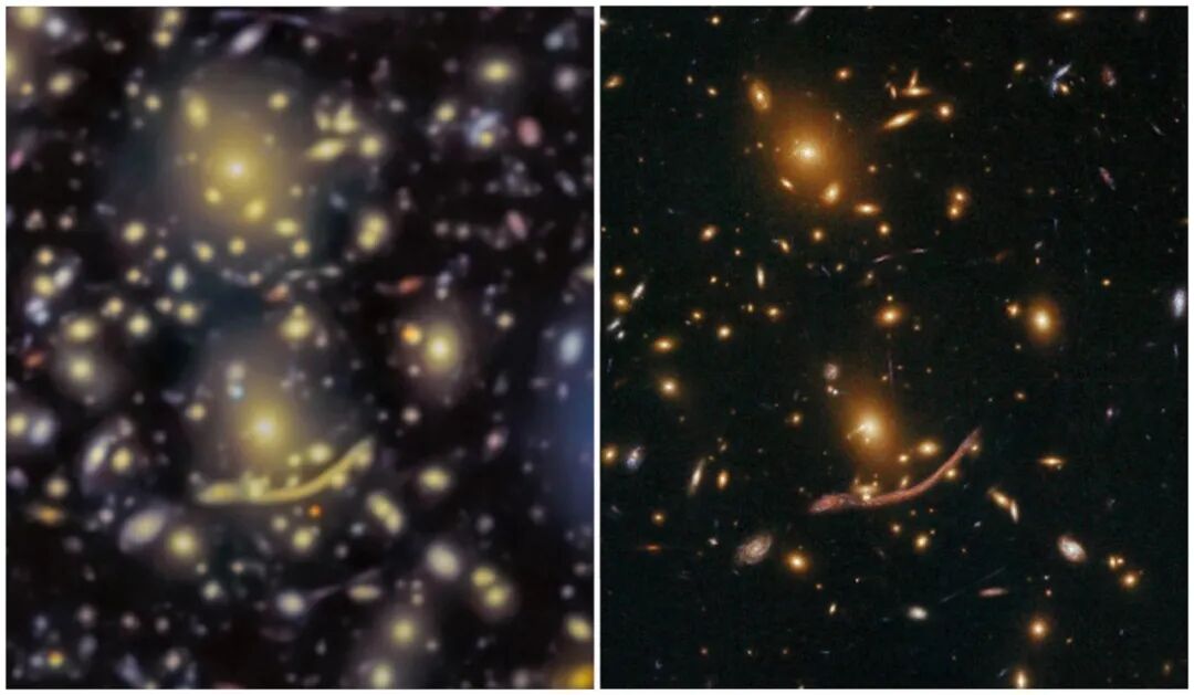 用引力透鏡把6億光年外的“放大鏡”Abell 370星系團(tuán)看穿,連哈勃都沒找到的星系被它揪出來:下圖對比了GTC(左)與哈勃太空望遠(yuǎn)鏡(HST)(右)拍攝的阿貝爾370星系團(tuán)中心。雖然哈勃的圖像空間分辨率更高,但GTC的圖像深度更深,揭示了更多此前未知、連哈勃都未能探測到的遙遠(yuǎn)暗弱星系。