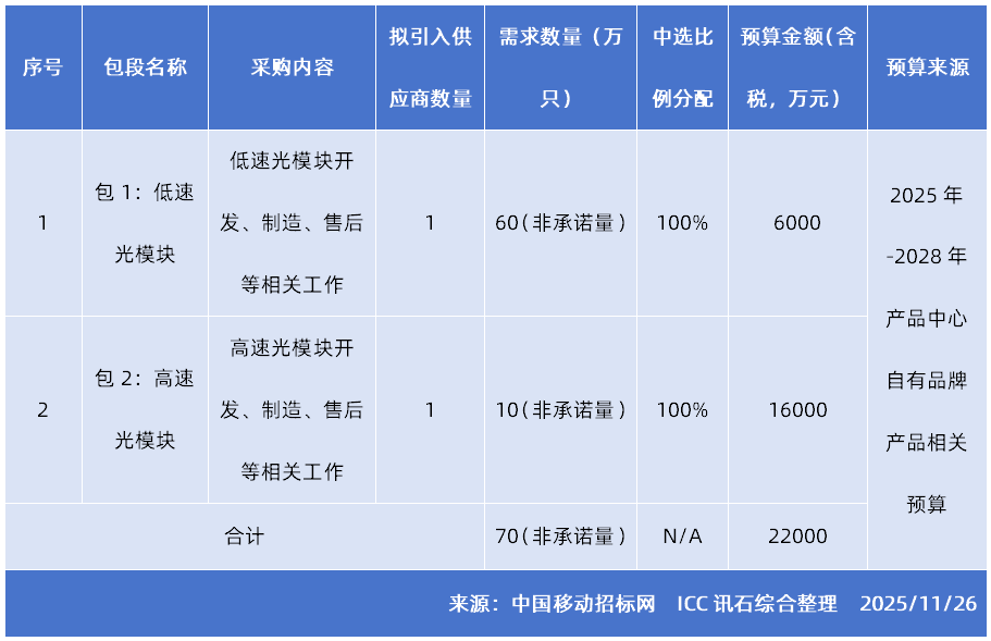 標(biāo)包一:60 萬只低速光模塊,預(yù)算 6 000 萬元,單價約 100 元,擬獨家供應(yīng);