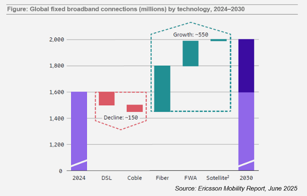 愛立信移動報告圖表顯示,2024年至2030年全球固定寬帶連接數(shù)(包括DSL、電纜、光纖、FWA和衛(wèi)星)將凈增約4億,其中光纖、FWA和衛(wèi)星合計增長約5.5億,DSL和電纜合計下降約1.5億。