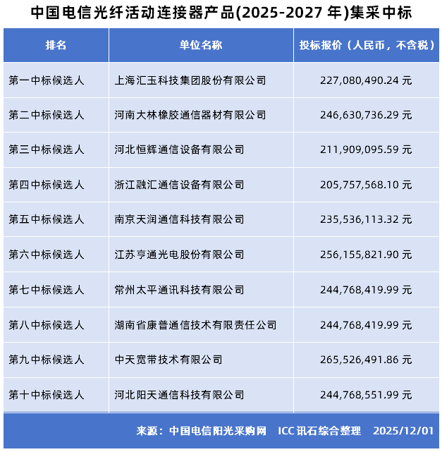 ICC訊 2025年12月1日,中國電信于陽光采購網發(fā)布《中國電信光纖活動連接器產品(2025年-2027年)集中采購項目中標候選人公示》。據公示顯示,本輪集采匯玨科技、亨通光電、中天寬帶等十家企業(yè)成功入選,涵蓋從東部沿海到中部地區(qū)的多家通信設備制造商。