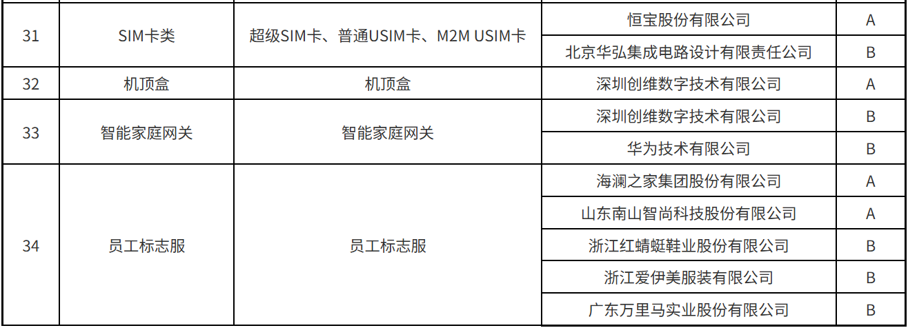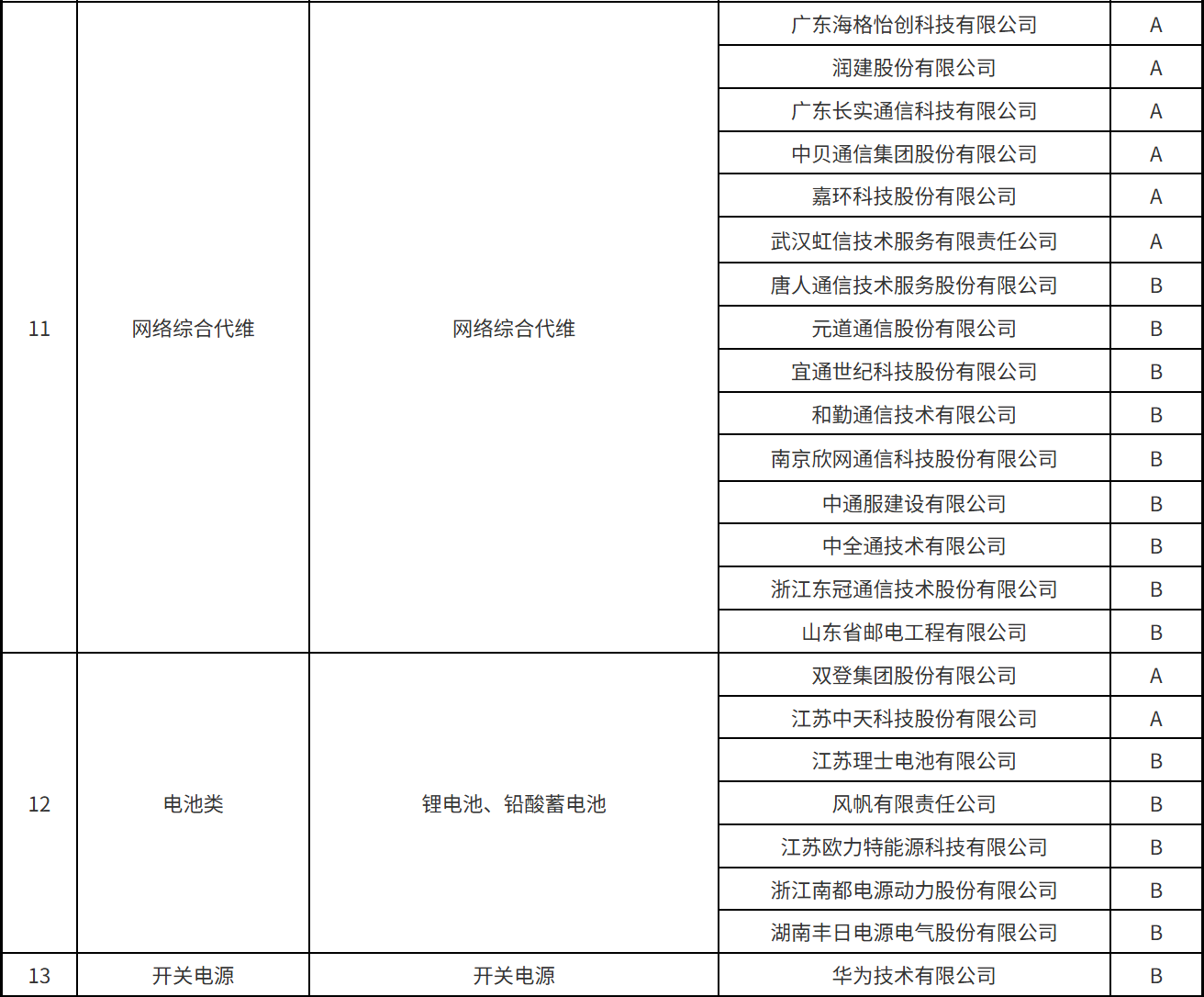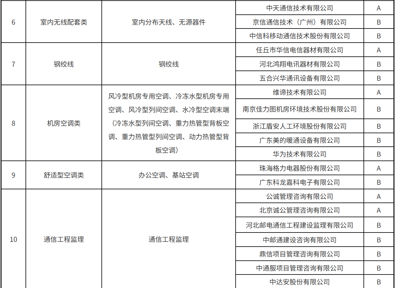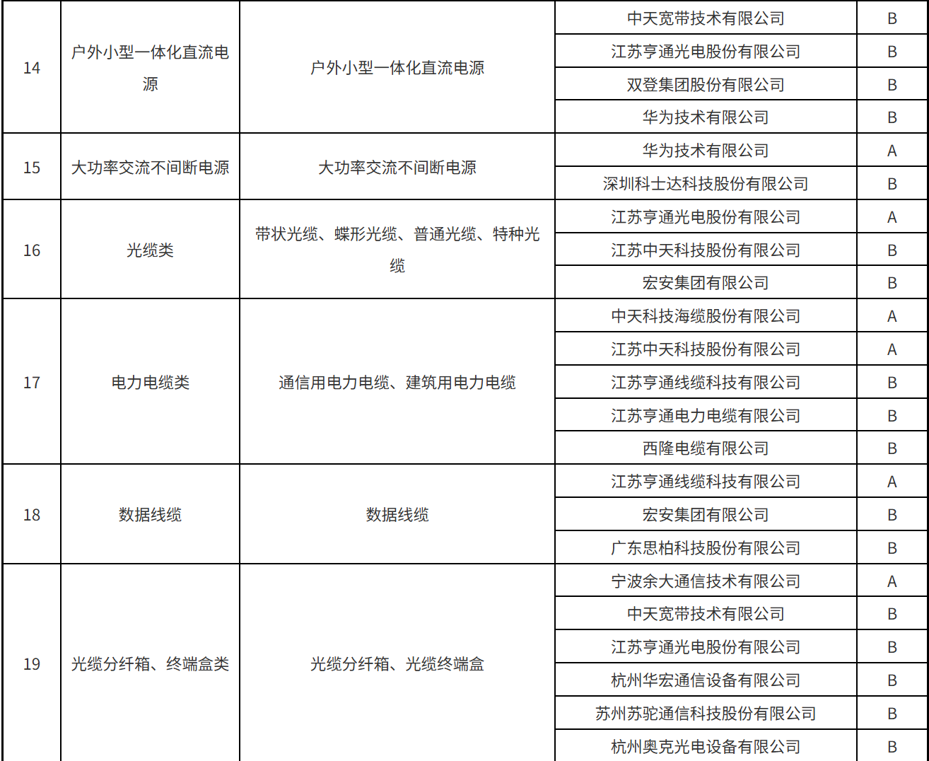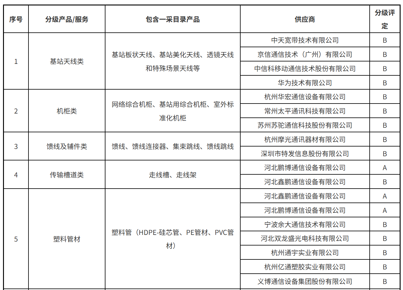 本次公示涵蓋了光纜類、光纖分纖箱/終端盒類、光纜交接箱/配線架類、光纜接頭盒、軟跳纖類、光分路器、數(shù)據(jù)線纜、基站前傳設(shè)備、數(shù)據(jù)中心/中低端交換機(jī)、智能家庭網(wǎng)關(guān)、基站天線類、機(jī)柜類等34個(gè)產(chǎn)品服務(wù)。A、B級(jí)供應(yīng)商名單具體的分級(jí)結(jié)果如下: