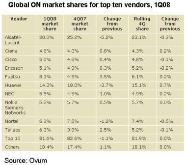 "The sequential decline, particularly after a super-hot 4Q07, was expected, while the strong growth over 1Q07 points to continued strength in spending for ON gear used for consolidating disparate services onto a single network and supporting growth in broadband consumer and enterprise services," said Ovum's vice president, optical networking, Dana Cooperson. "The trends we've been following for at least the past year -- the increasing fraction of ON spending dedicated to metro WDM, the shift in end-to-end solutions marketing (if not purchasing), growing investment in undersea capacity, the growing addressable market for ON gear as emerging markets and alternative network builders take out their wallets, network evolution built on more packet-capable, agile, and resilient networks -- remain powerful forces for market growth and spending shifts. Of the top ten vendors, Ciena, Fujitsu, NEC, and Tellabs all posted positive sequential and year-over-year results; Alcatel-Lucent and Huawei both followed strong 4Q07 results with expected sequential declines; and only Nortel posted both sequential and year-over-year declines."