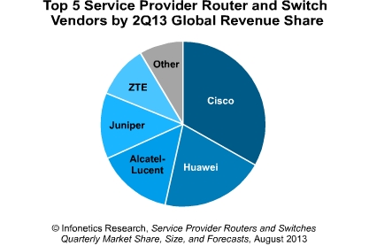 ICCSZ訊 日前,市場調(diào)研公司Infonetics公布其2013年2季度關(guān)于服務(wù)提供商路由器和交換機的市場份額和初步分析報告。