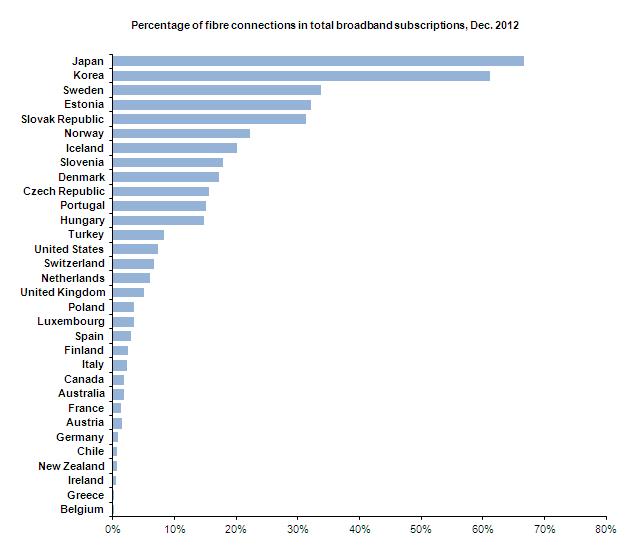 2012 OECD國家光纖寬帶用戶普及率排名