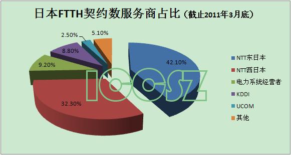 * FTTH契約數(shù)為2023.6萬(wàn),相比去年年底增長(zhǎng)率為2.3%。各服務(wù)供應(yīng)商份額相比2010年底基本持平,東西NTT占比74.4%(下滑0.1個(gè)百分點(diǎn)),電力系統(tǒng)經(jīng)營(yíng)者占比9.2%(上升0.1個(gè)百分點(diǎn)),KDDI占比8.8%(上升0.2個(gè)百分點(diǎn));