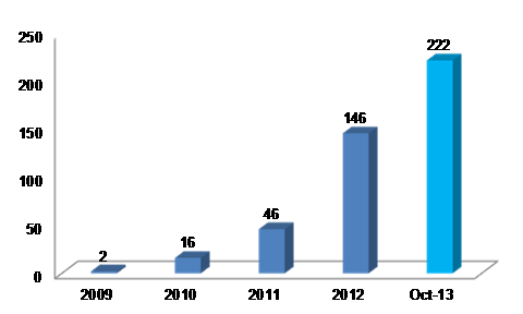 ICCSZ訊 2013年10月22號(hào),據(jù)GSA關(guān)于LTE建設(shè)進(jìn)展的最新報(bào)告,全球已經(jīng)有222家運(yùn)營(yíng)商確認(rèn)在83個(gè)國(guó)家或地區(qū)推出了LTE商用服務(wù)。在過去的12個(gè)月中共有109個(gè)LTE商用網(wǎng)絡(luò)被推出。