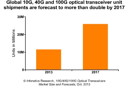 *2013年上半年,10G、40G和100G收發(fā)器市場(chǎng)收入同比上漲4%,到達(dá)8.82億美元;