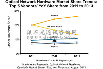 ICCSZ訊 日前,市場(chǎng)研究公司Infonetics發(fā)布最新的2013年2季度光網(wǎng)絡(luò)硬件市場(chǎng)份額與初步分析報(bào)告。