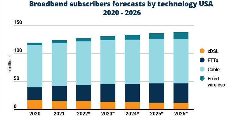 ICC訊 Dataxis的研究顯示,到2026年,美國(guó)家庭寬帶普及率將達(dá)到近100%的,盡管該市場(chǎng)歷來由有線運(yùn)營(yíng)商主導(dǎo),但光纖網(wǎng)絡(luò)將在該行業(yè)增長(zhǎng)中發(fā)揮最重要的作用。