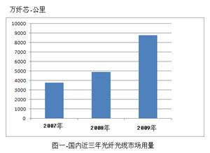 2009年雖然面對(duì)全球經(jīng)濟(jì)危機(jī),但在國(guó)家拉動(dòng)內(nèi)需的戰(zhàn)略方針指導(dǎo)下,隨著3G、FTTX建設(shè)的大規(guī)模展開(kāi),國(guó)內(nèi)光纖光纜市場(chǎng)需求急速增長(zhǎng)。相對(duì)2008年市場(chǎng)需求增長(zhǎng)率高達(dá)81%,用量達(dá)8800萬(wàn)纖芯公里左右,占世界總用量18,000萬(wàn)纖芯公里的48%。2010年將隨著3G、FTTX及智能電網(wǎng)建設(shè)的進(jìn)一步展開(kāi),光纖光纜市場(chǎng)將繼續(xù)保持增長(zhǎng)態(tài)勢(shì)。