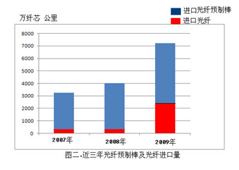 2.國(guó)內(nèi)近三年光纖預(yù)制棒及光纖進(jìn)口量