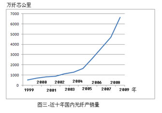 如國(guó)三所示:2005年以來(lái)國(guó)內(nèi)光纖產(chǎn)銷量增長(zhǎng)速率明顯增大,2008年至2009年更為顯著。