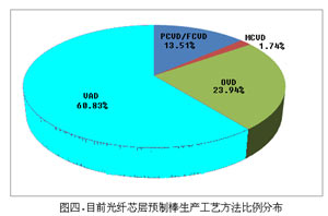 如圖四所示光纖芯層預(yù)制棒生產(chǎn)工藝主要采用VAD生產(chǎn)工藝方法,占總量的60.83%;其次為OVD占總量23.94%;PCVD/FCVD占總量的13.51%;MCVD占總量的1.74%。