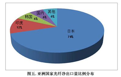 如圖五所示:亞洲國(guó)家光纖凈出口國(guó)主要為日本,其次為韓國(guó)、印度,國(guó)內(nèi)光纖廠家凈出口量?jī)H為200萬(wàn)纖芯公里。占世界光纖總量的1%、占亞洲國(guó)家光纖凈出口量的6%。