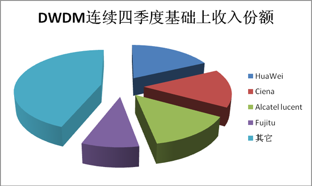 該研究還指出DWDM市場(chǎng)在各地區(qū)均有所增長(zhǎng),同比增長(zhǎng)率最高的地區(qū)是EMEA和拉美地區(qū),二者的增長(zhǎng)率均超過(guò)50%。設(shè)備供應(yīng)商在過(guò)去四個(gè)季度(Q310-Q211)基礎(chǔ)上的收入份額如下: