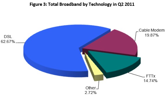 從寬帶接入技術(shù)來(lái)看,DSL仍然是最普遍的,其寬帶用戶數(shù)約為3.5億,占總寬帶用戶數(shù)的62.67%。其次是Cable Modem用戶,占總寬帶用戶數(shù)的19.87%。排第三的FTTx用戶占14.74%。三種技術(shù)中目前最少使用但最具創(chuàng)新性的是FTTx技術(shù),這種技術(shù)往往用于下一代網(wǎng)絡(luò)。2011年第二季度,F(xiàn)TTx用戶是增長(zhǎng)最快的,季度增長(zhǎng)率為7.23%,新增用戶數(shù)為554萬(wàn)。Cable Modem和DSL增長(zhǎng)率分別為1.8%和1.7%。