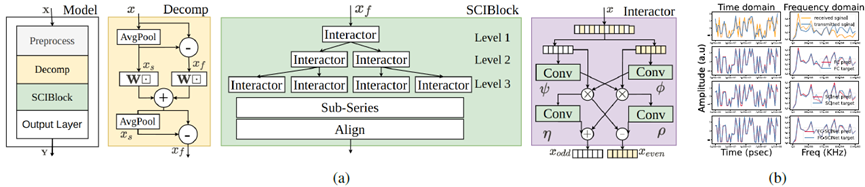 圖1. (a) 展示了創(chuàng)新的FC-SCINet均衡器的框圖。(b) 顯示了50個傳輸(目標)/接收連續(xù)樣本的時間/頻率域表示,分別顯示了FC和SCInet的影響。