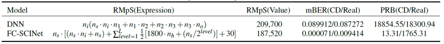 FC-SCINet的復(fù)雜性與最佳3層DNN [60,64,18個神經(jīng)元]之間進行了比較,使用的度量標準是每個符號的實際乘法次數(shù)(RMpS)[6]。通過RMpS與中位誤碼率(mBER)的乘積來表征誤碼率和復(fù)雜性之間的權(quán)衡,稱為PRB。表1提供了RMpS、PRB及其實例的分析表達式。從RMpS值來看,F(xiàn)C-SCINet相比所采用的DNN可減少10.577%的復(fù)雜性。