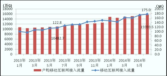 圖7. 2013-2014年各月移動互聯(lián)網(wǎng)接入流量和戶均流量比較