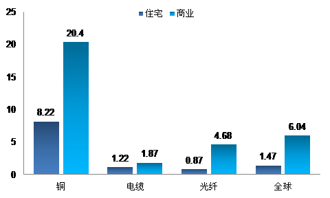 在住宅市場(chǎng),銅的服務(wù)提供的性?xún)r(jià)比最低。對(duì)于所有用戶(hù)來(lái)說(shuō)商業(yè)用戶(hù)支付的錢(qián)比住宅用戶(hù)多得多,這反映了較高的使用率和平均帶寬,企業(yè)所需求的服務(wù)比一般用戶(hù)要多。