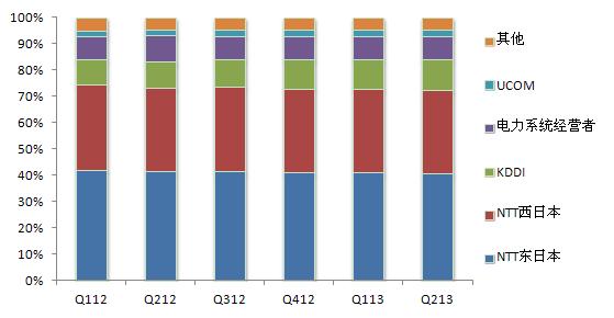 DSL用戶相比3月底的時的數據減少4.9%至516萬。DSL服務供應商方面,軟銀BB(Softbank BB)收購了eAccess,所以其占比上升至63.2%,東西NTT占比下滑0.1%至34.0%,并且其份額呈現下滑趨勢。