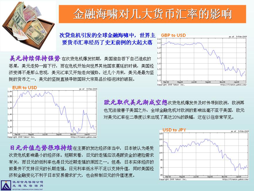 分析人士認(rèn)為,在金融危機(jī)未有好轉(zhuǎn)之時(shí),美元在一定時(shí)限內(nèi)將繼續(xù)保持強(qiáng)勢(shì)上揚(yáng)的趨勢(shì)。中國(guó)社科院世經(jīng)所張明博士認(rèn)為,盡管從長(zhǎng)期來(lái)看,在美國(guó)財(cái)政赤字暴增的趨勢(shì)下,美元有大幅貶值的可能,但金融危機(jī)的不斷蔓延,往往令投資者會(huì)尋求流動(dòng)性好的美元資產(chǎn)實(shí)現(xiàn)資產(chǎn)保值,帶動(dòng)市場(chǎng)不斷買入美元,導(dǎo)致近期以來(lái)美元持續(xù)上揚(yáng)和非美貨幣的走軟甚至是暴跌。