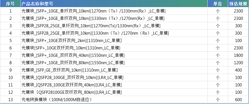 根據公告,此次集采擬采購13種型號光模塊產品,合計數量約為11830個,涉及產品型號及預估規(guī)模如下表,最終采購數量以招標人實際下達的采購訂單為準。采購預算為230.9萬元(不含稅)。