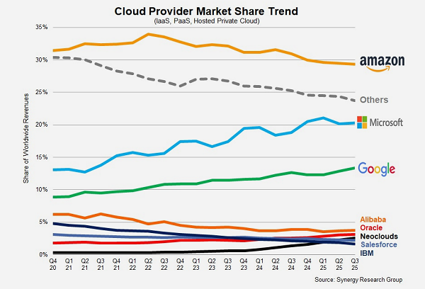 ICC訊 Synergy Research Group最新數(shù)據(jù)顯示,2025年第三季度企業(yè)云基礎(chǔ)設(shè)施服務(wù)支出中,亞馬遜、微軟和谷歌共同占據(jù)63%市場份額。這一數(shù)字在四個季度前為62%,再往前四個季度為61%。在云服務(wù)使用熱潮推動全球市場規(guī)模從八個季度前的680億美元增長至本季度1070億美元的同時,三巨頭的市場份額呈現(xiàn)穩(wěn)步提升態(tài)勢。