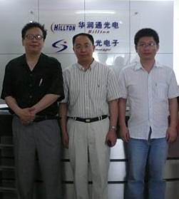 訊石董事長石明與深圳市華潤通光電有限公司總經(jīng)理鐘文欽和市場總監(jiān)周立強(qiáng)合影。
