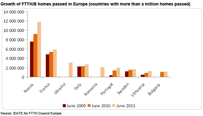 在獨(dú)聯(lián)體國(guó)家中,由于其特定的人口特色,俄羅斯在FTTH/B用戶和家庭覆蓋數(shù)方面都處于領(lǐng)先地位,并且擁有巨大市場(chǎng)潛力,截止2011年6月底,其FTTH/B用戶達(dá)510萬(wàn),家庭覆蓋數(shù)為1170萬(wàn)。烏克蘭FTTH/B用戶數(shù)接近50萬(wàn),在不久的將來(lái),我們希望看到新的服務(wù)供應(yīng)商加入FTTH/B網(wǎng)絡(luò)部署行列。