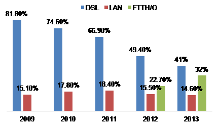 ICCSZ訊 近年來隨著國家加大對電信基礎(chǔ)設(shè)施的建設(shè),我國電信業(yè)有了較大的發(fā)展,尤其是FTTH/O在2012年和2013年實(shí)現(xiàn)大幅度增長,從2012年互聯(lián)網(wǎng)寬帶接入端口技術(shù)比例為22.7%,到2013年提升到32%,而DSL則出現(xiàn)大幅度下降。