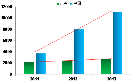 圖一表明我國光進(jìn)銅退正在快速的進(jìn)行中,而圖二則列出的是中國地區(qū)與北美地區(qū)FTTH覆蓋數(shù)對比情況:從2011年到2013年FTTH覆蓋數(shù)中國分別是北美地區(qū)的1.68倍、3.09倍和4.15倍。