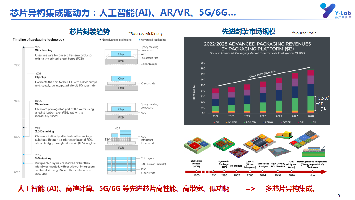 隨著人工智能、高速計算、5G/6G等應(yīng)用場景的不斷深化,先進封裝技術(shù)呈現(xiàn)出明顯的發(fā)展趨勢:先進芯片向著高性能、高帶寬、低功耗方向演進,推動多芯片異構(gòu)集成成為產(chǎn)業(yè)必然選擇。