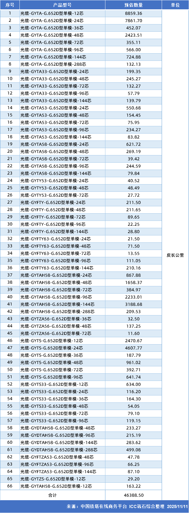 據(jù)披露,預(yù)估采購(gòu)總長(zhǎng)度約達(dá)46388.5皮長(zhǎng)公里。需求量較大的型號(hào)包括GYTA-12芯(8859.36皮長(zhǎng)公里)、GYTA-24芯(7861.7皮長(zhǎng)公里)及GYTS-24芯(4607.77皮長(zhǎng)公里)等。